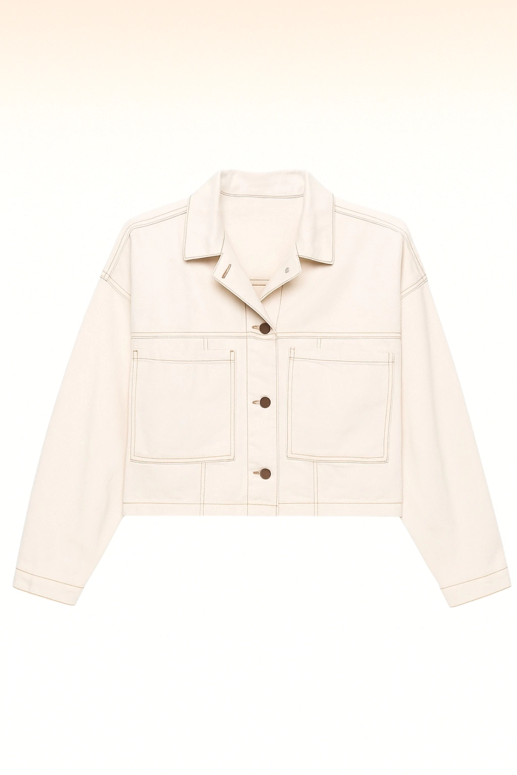 Jaqueta em jeans off white com acabamento de alta qualidade. Peça versátil, perfeita para compor looks estilosos em qualquer estação.